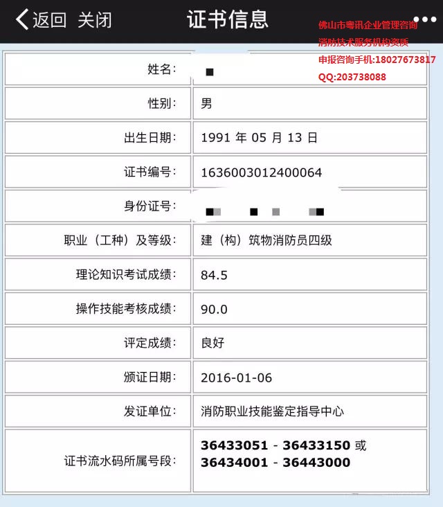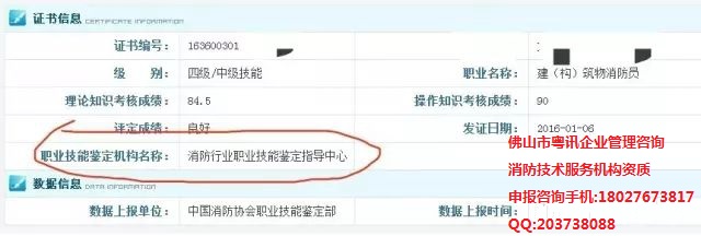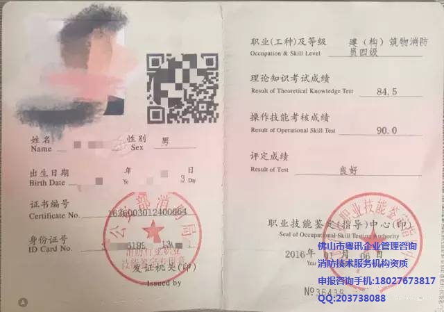 近期,佛山市粤讯企业管理咨询公司接到相关消防检测维护保养、消防工程施工安装等客户企业单位的反映:经常收到短信、微信、电话,对方称可以办”建(构)筑物消防员“证书,初级、中级、高级,甚至更高级别都能办,国家网上可以查询。现就佛山粤讯企业管理咨询有限公司小编就公安部消防局颁发的”建(构)筑物消防员“职业资格证书进行简要说明及鉴别真伪: