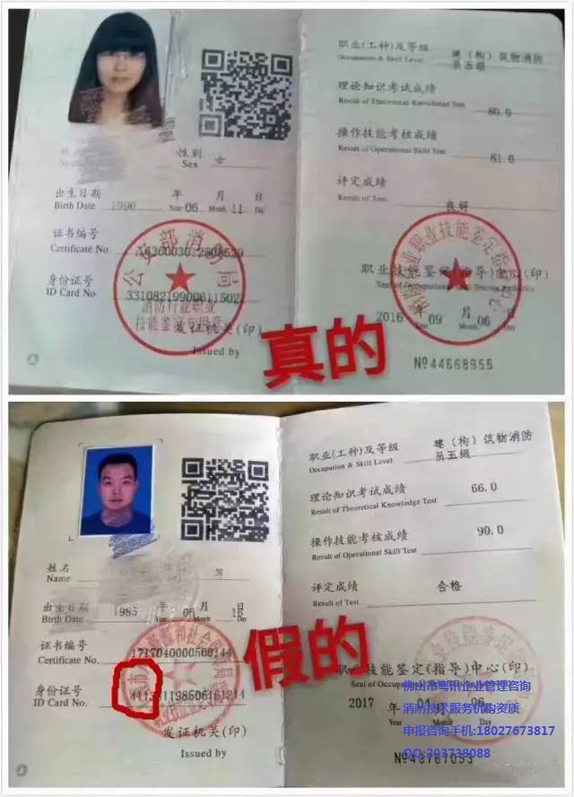 这种证,证件本身不是个人制作,通过XX省或XX市非消防行业鉴定中心制作、上传,上网可以查询到,这就是对方所说的”真“。假就假在没有”公安部消防局“和”消防行业特有工种职业技能鉴定指导中心“的印章,而是XX省或XX市冠名的印章。这种证一眼便知。