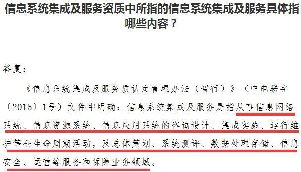 对的,信息系统集成及服务资质认证中的信息系统集成及服务指的就是从事信息网络系统、信息资源系统、信息应用系统的咨询设计、集成实施、运行维护等全生命周期活动,及总体策划、系统测评、数据处理存储、信息安全、运营等服务和保障业务领域。