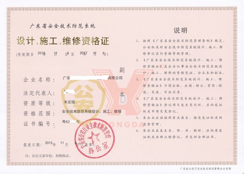 1、持有《广东省安全技术防范系统设计、施工、维修资格证》(以下简称《资格证》)一级,也就是安防资质认证一级《资格证》的单位可承接任何技防系统的设计、施工、维修业务;