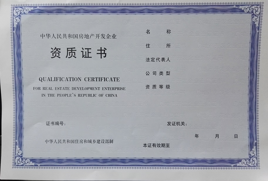 下图为佛山市房地产开发企业暂定资质证书样本